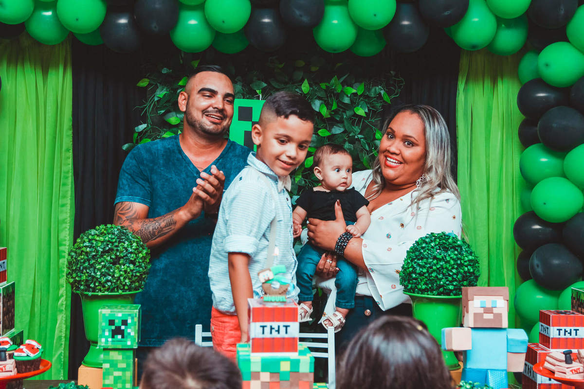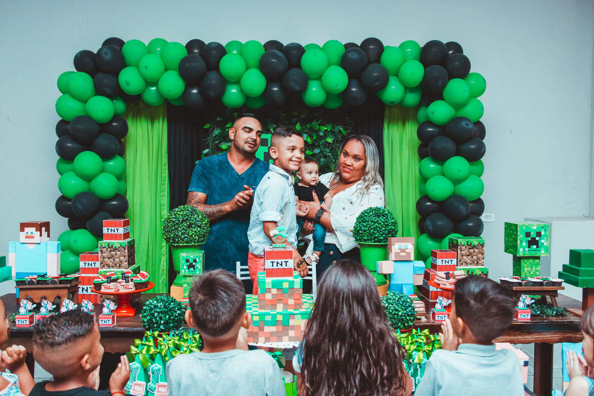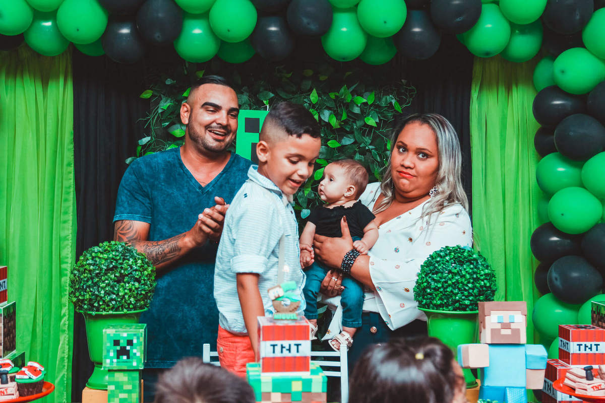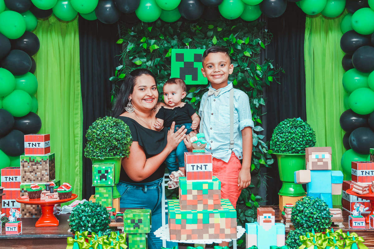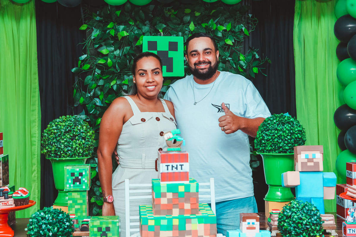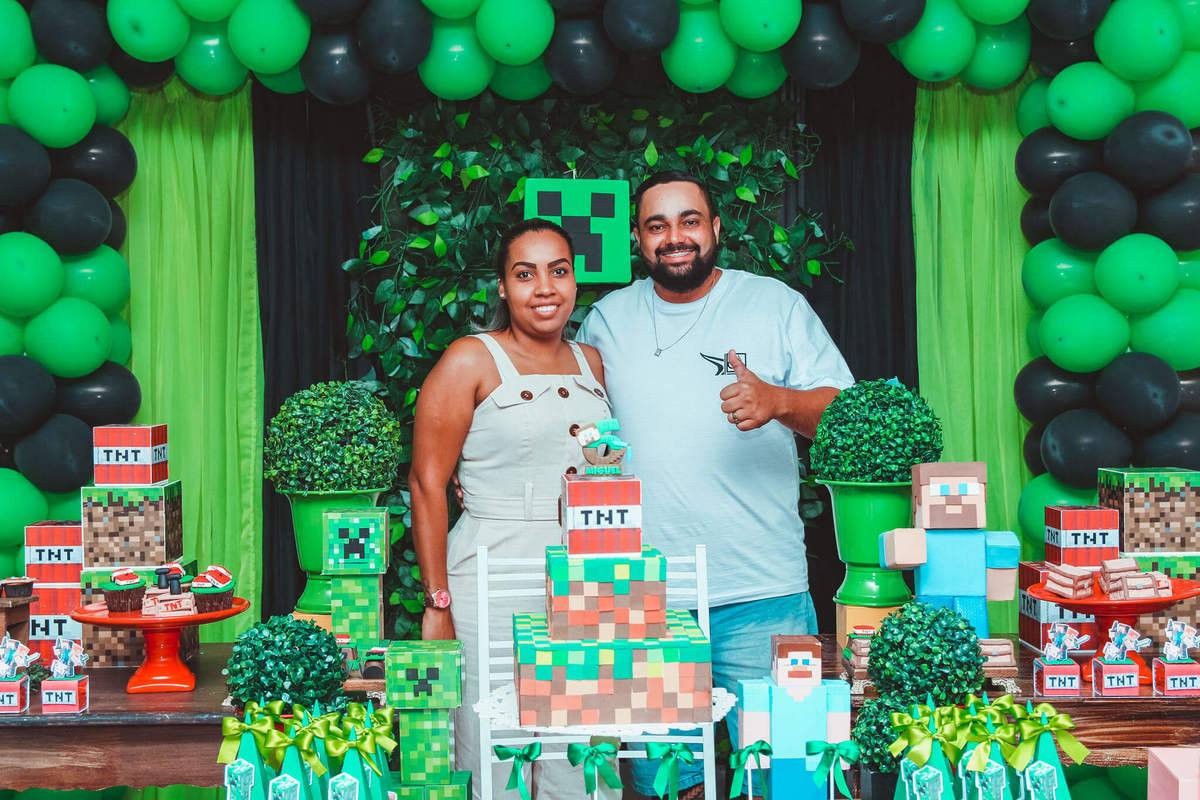 A decoração foi toda com o tema do MineCraft. tudo muito bem arrumado e pensado com carinho pelo pessoal do Colorê Buffet Infantil, em Americana / SP. O salão é lindo, muitos brinquedos paras as crianças e os instrutores são bem atenciosos.