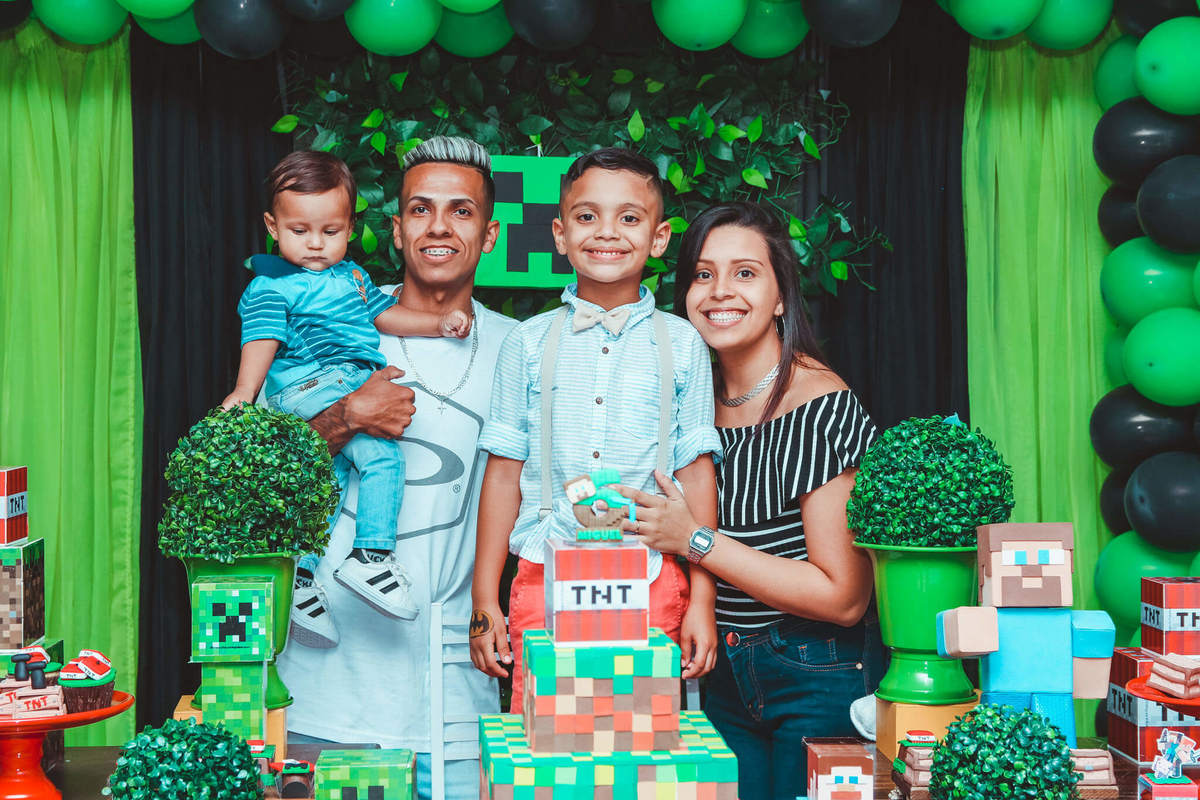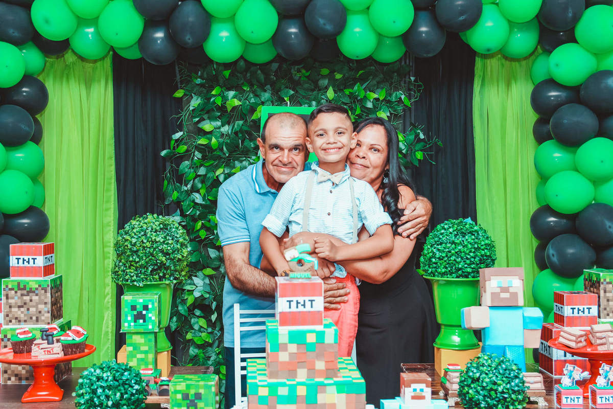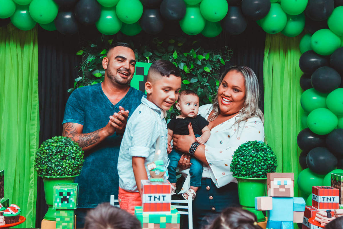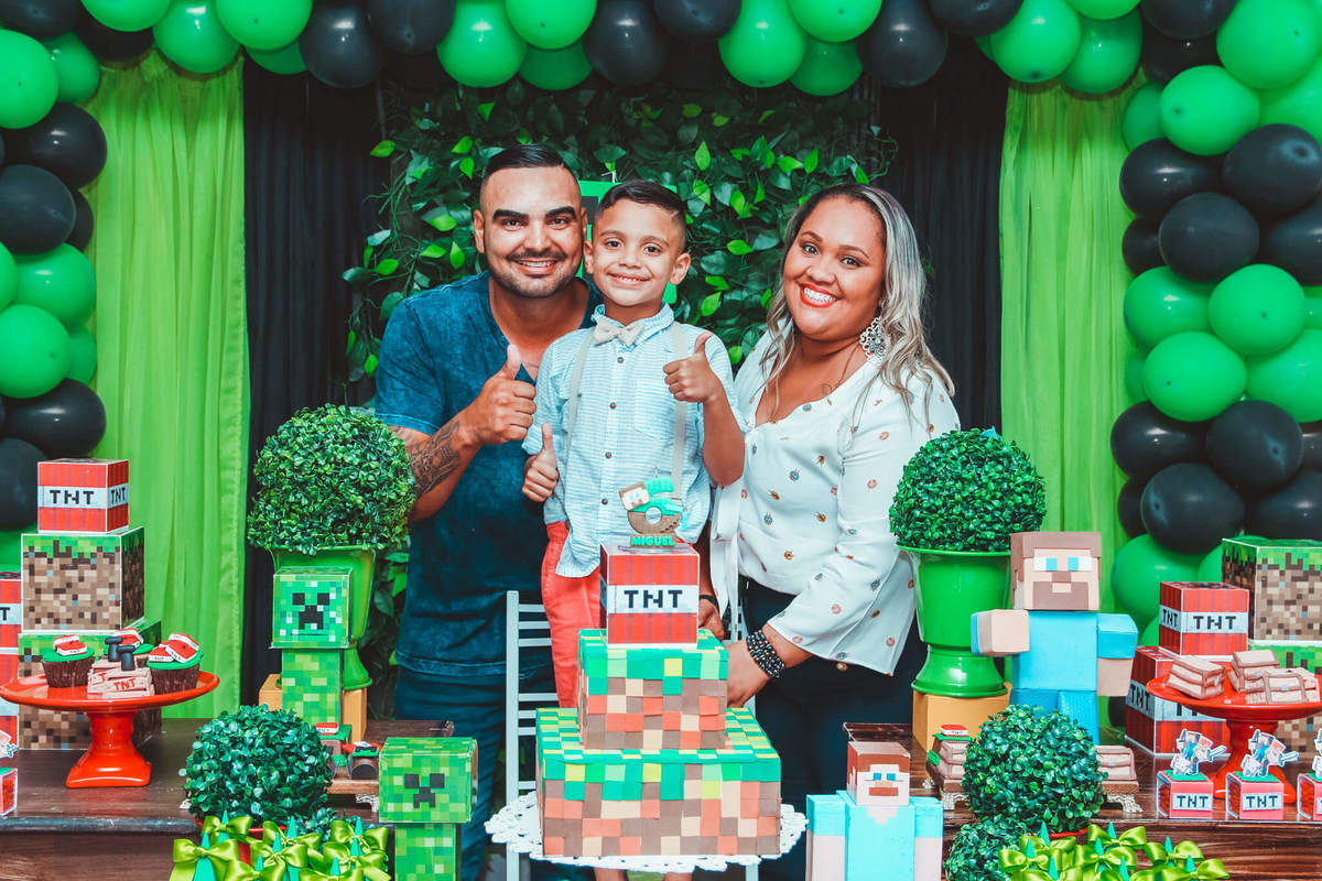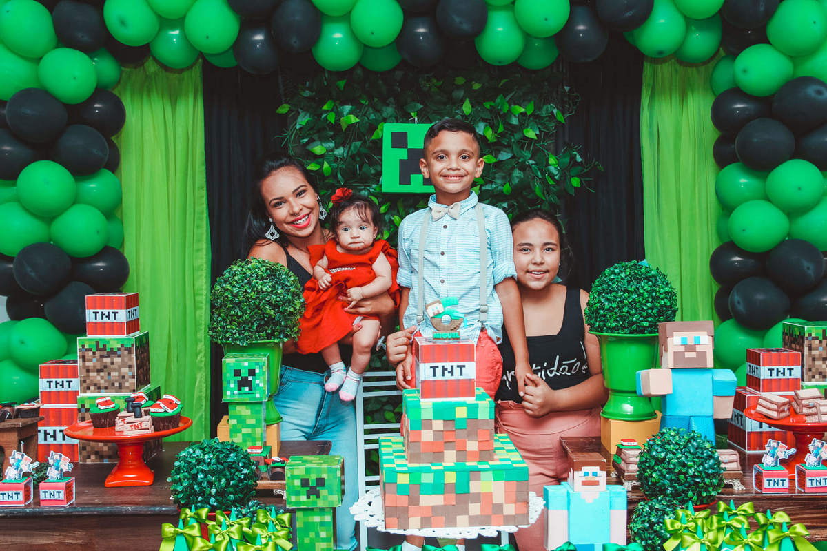 A decoração foi toda com o tema do MineCraft. tudo muito bem arrumado e pensado com carinho pelo pessoal do Colorê Buffet Infantil, em Americana / SP. O salão é lindo, muitos brinquedos paras as crianças e os instrutores são bem atenciosos.