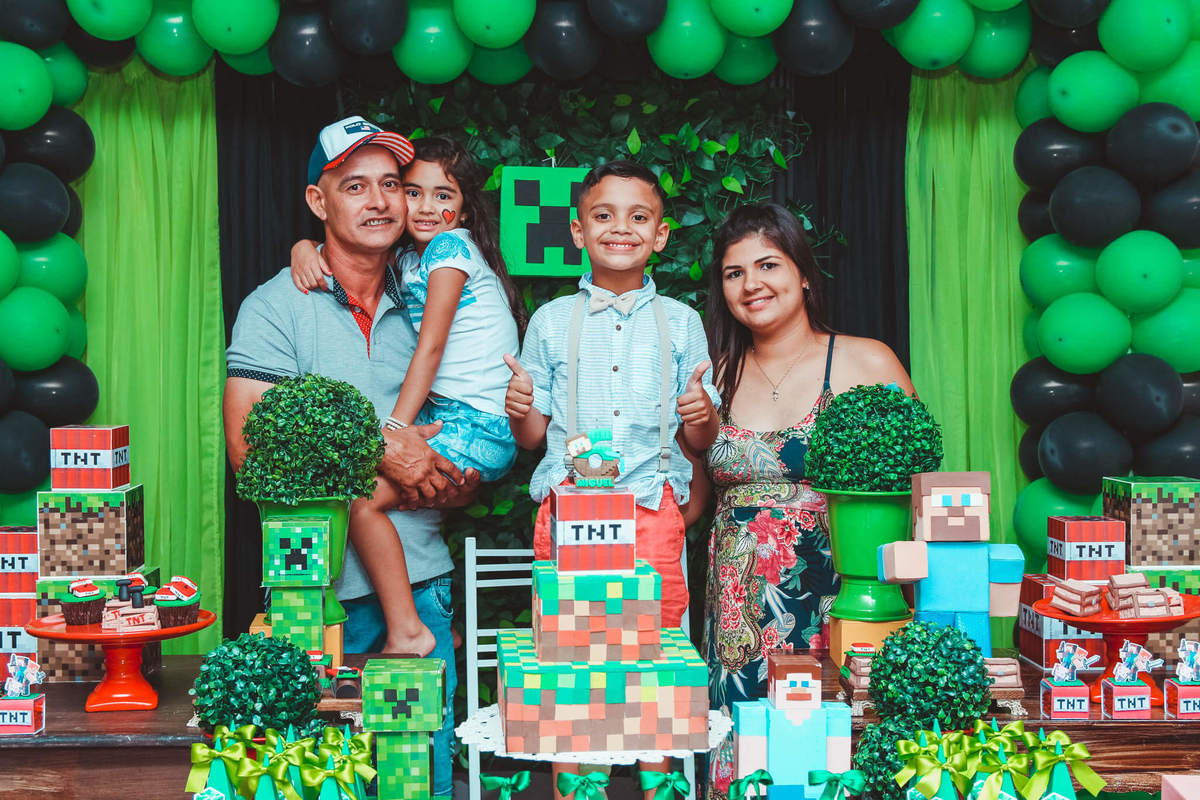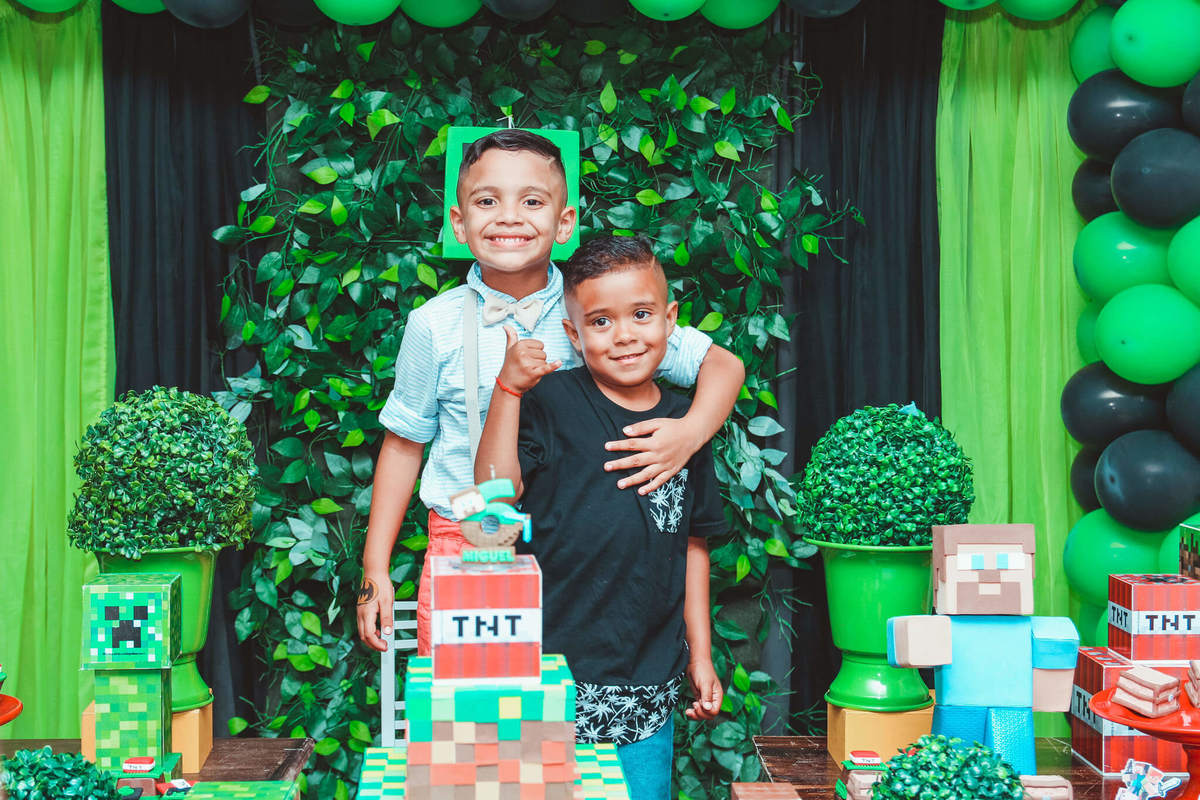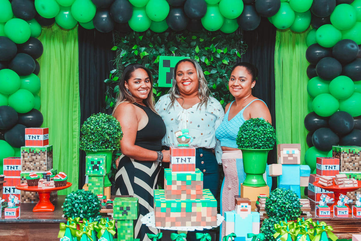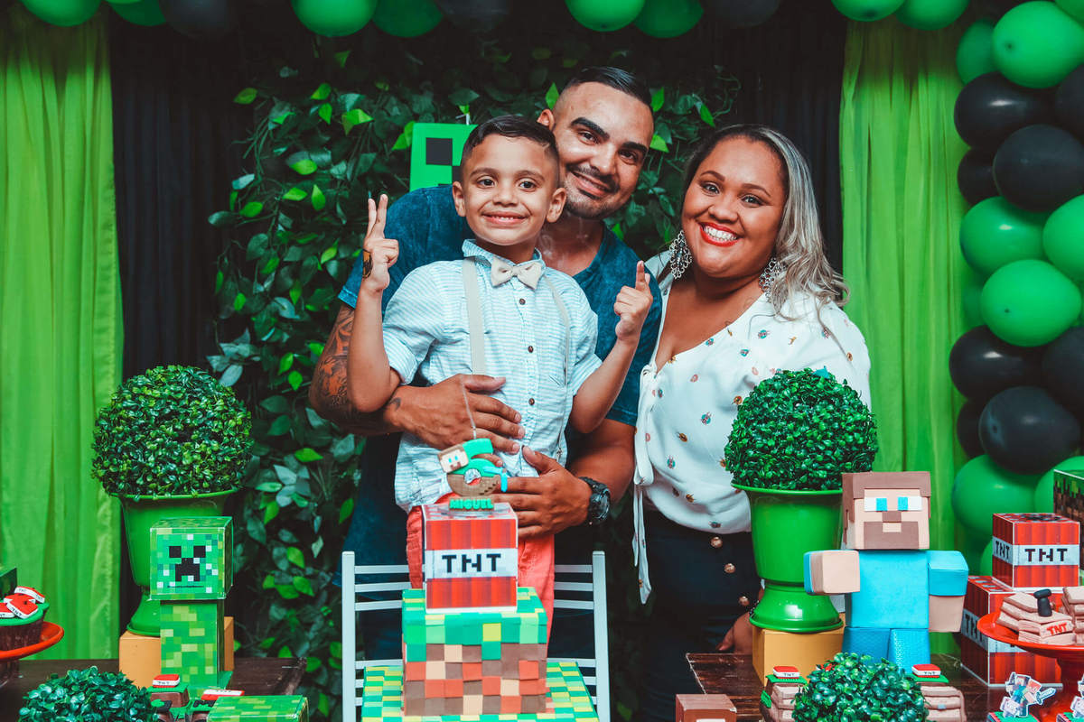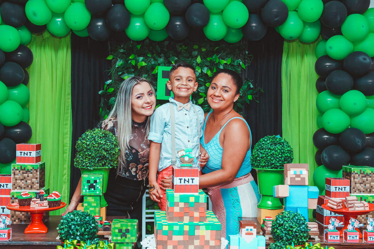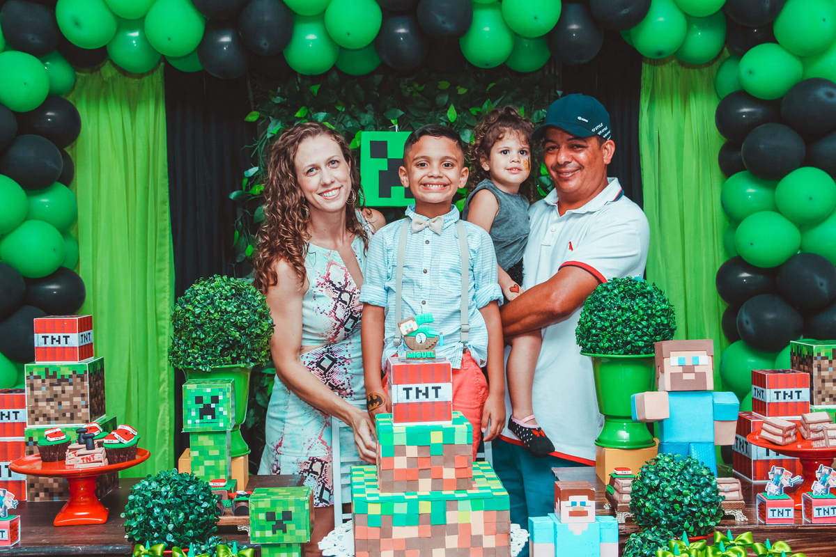 A decoração foi toda com o tema do MineCraft. tudo muito bem arrumado e pensado com carinho pelo pessoal do Colorê Buffet Infantil, em Americana / SP. O salão é lindo, muitos brinquedos paras as crianças e os instrutores são bem atenciosos.
