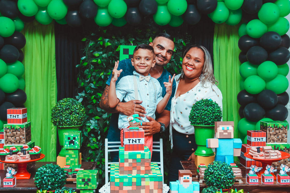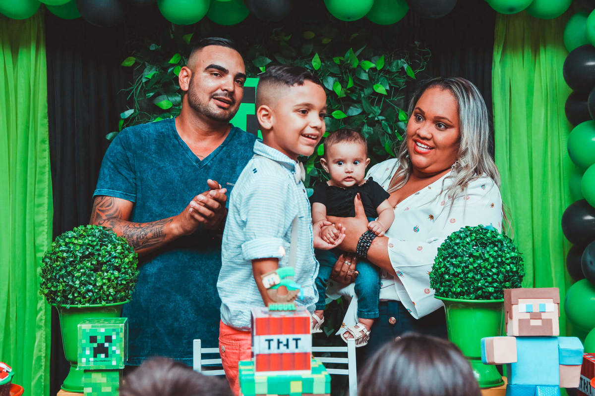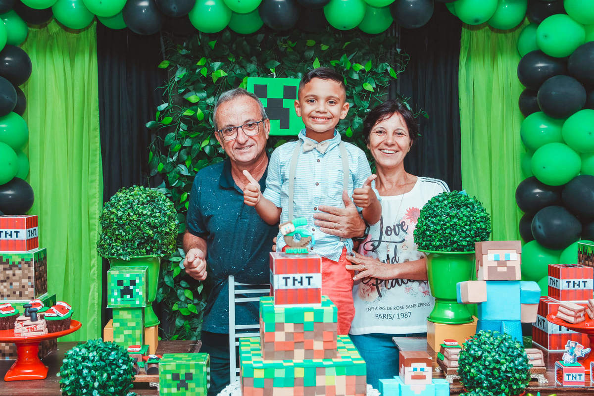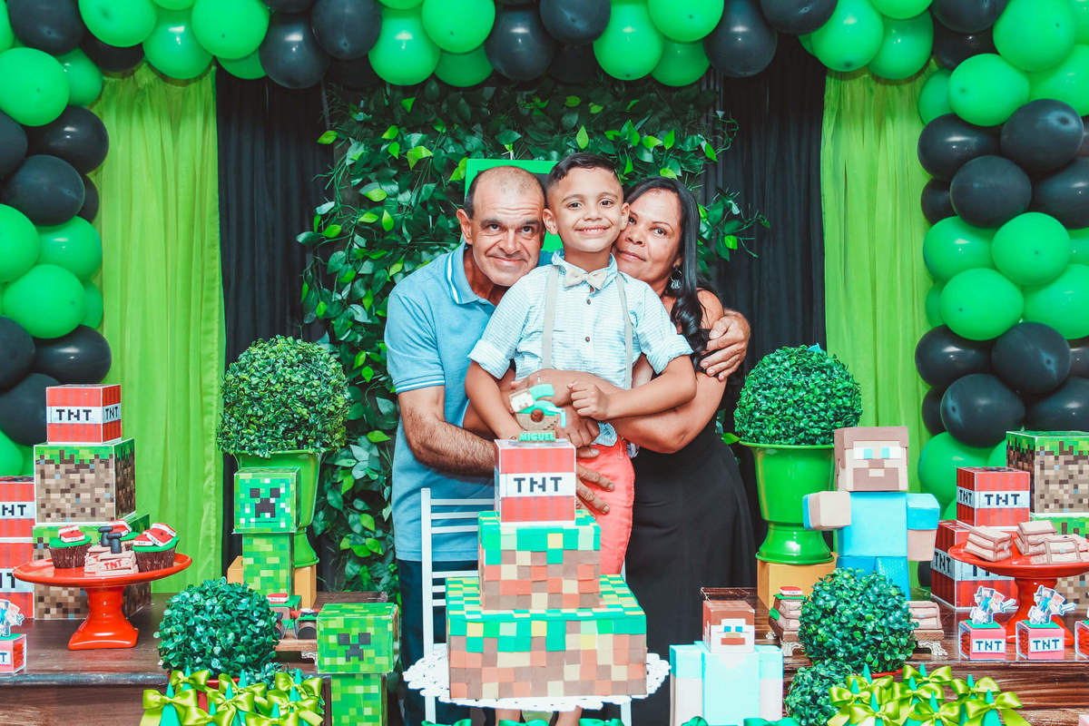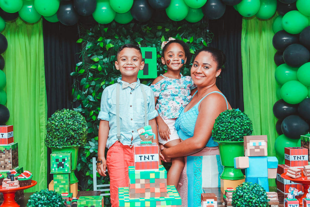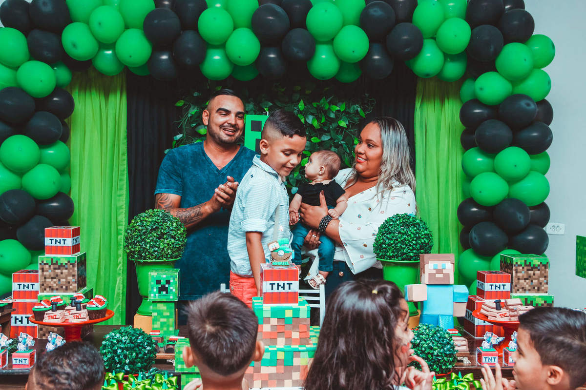 A decoração foi toda com o tema do MineCraft. tudo muito bem arrumado e pensado com carinho pelo pessoal do Colorê Buffet Infantil, em Americana / SP. O salão é lindo, muitos brinquedos paras as crianças e os instrutores são bem atenciosos.