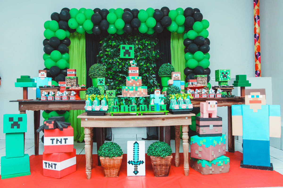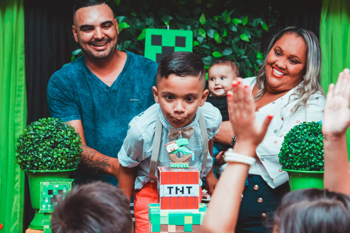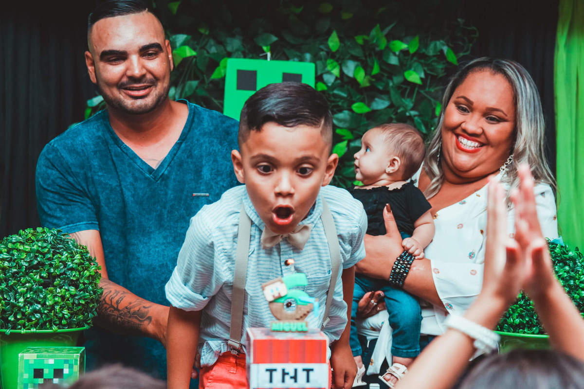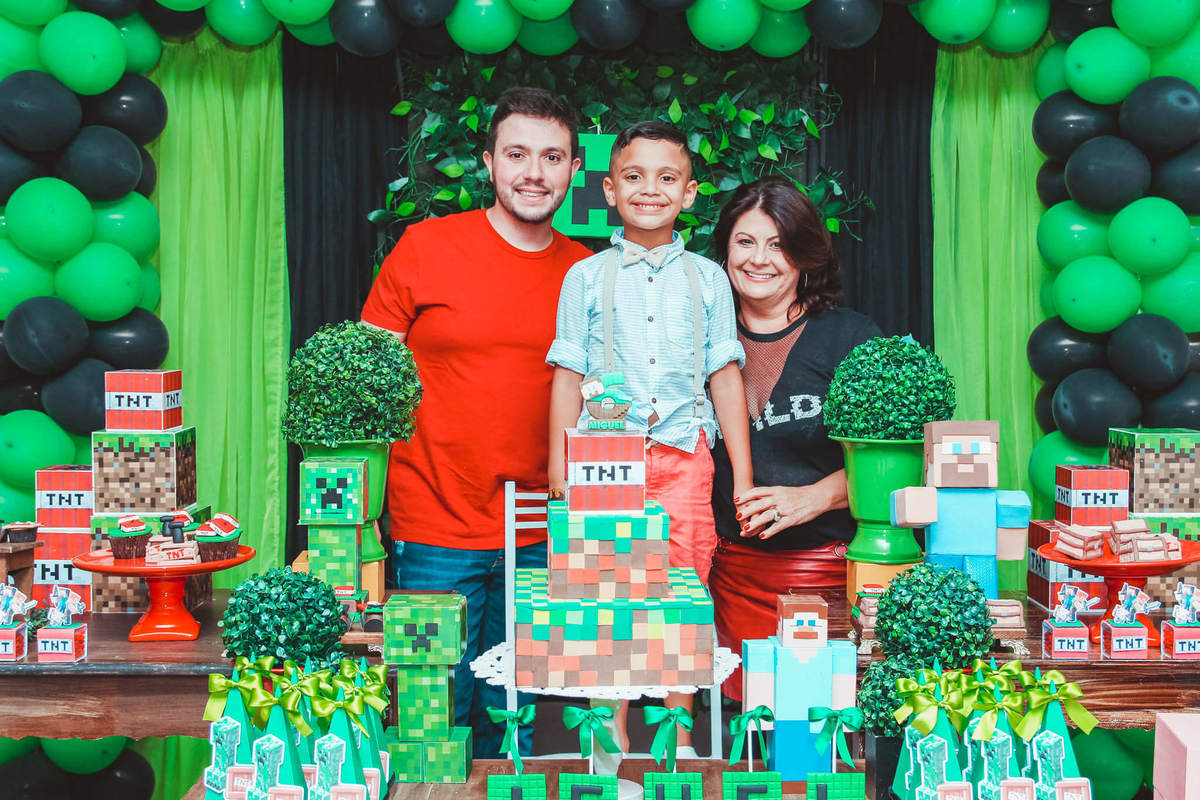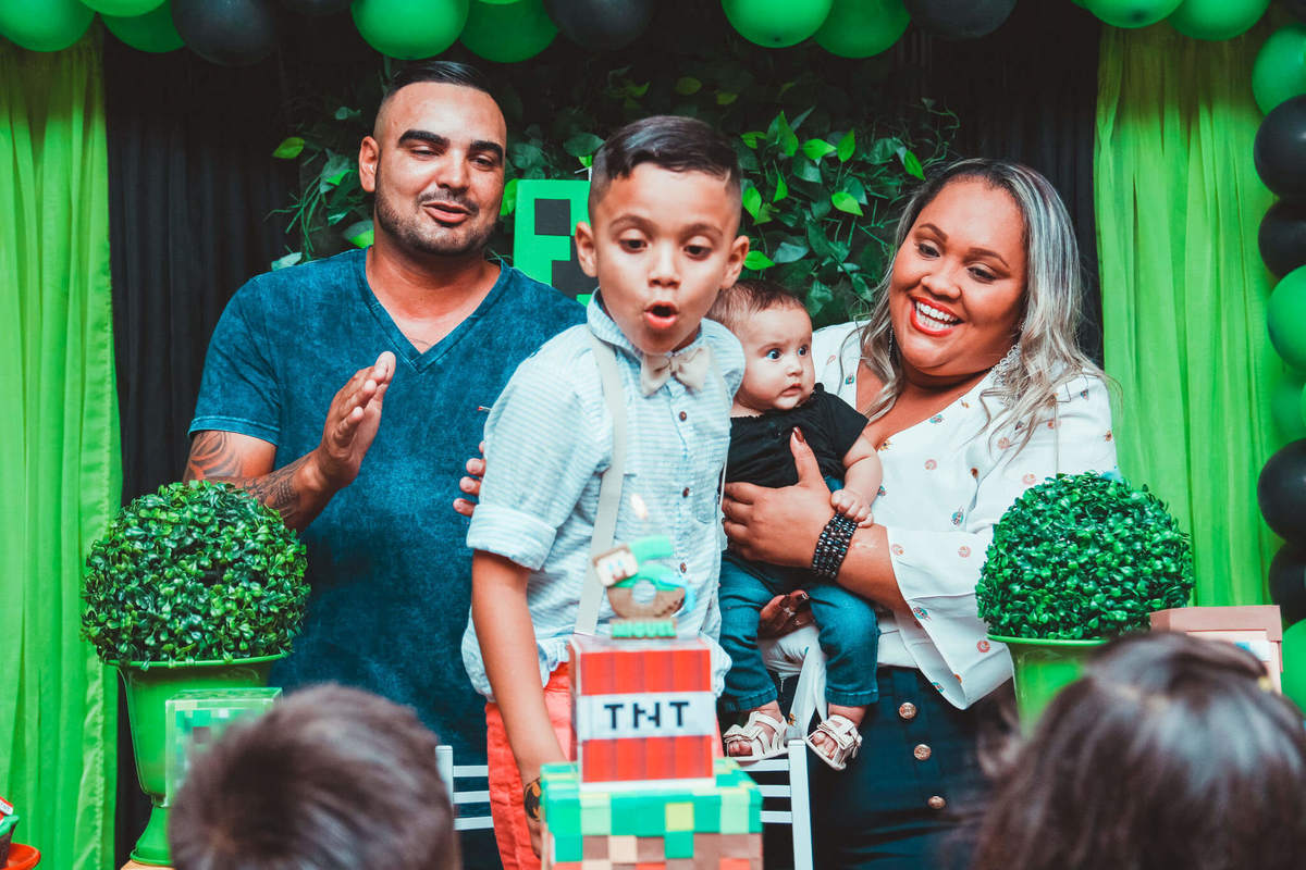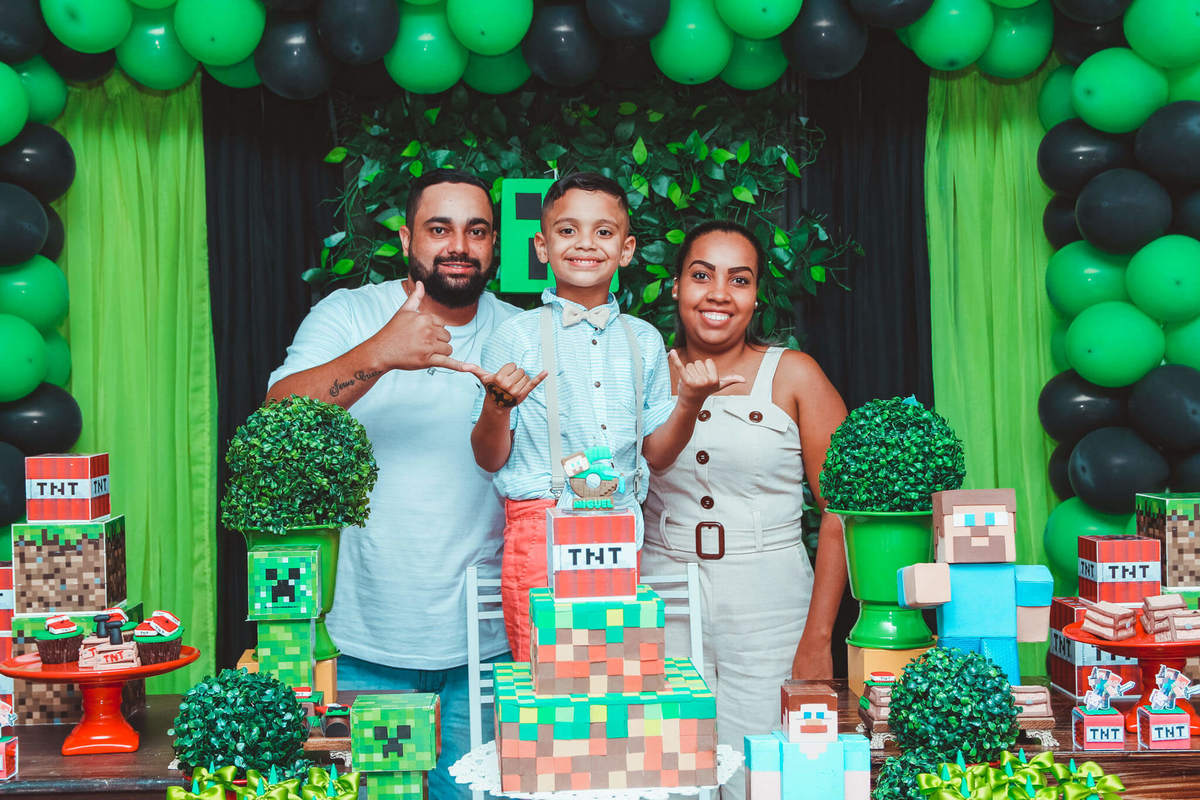 A decoração foi toda com o tema do MineCraft. tudo muito bem arrumado e pensado com carinho pelo pessoal do Colorê Buffet Infantil, em Americana / SP. O salão é lindo, muitos brinquedos paras as crianças e os instrutores são bem atenciosos.